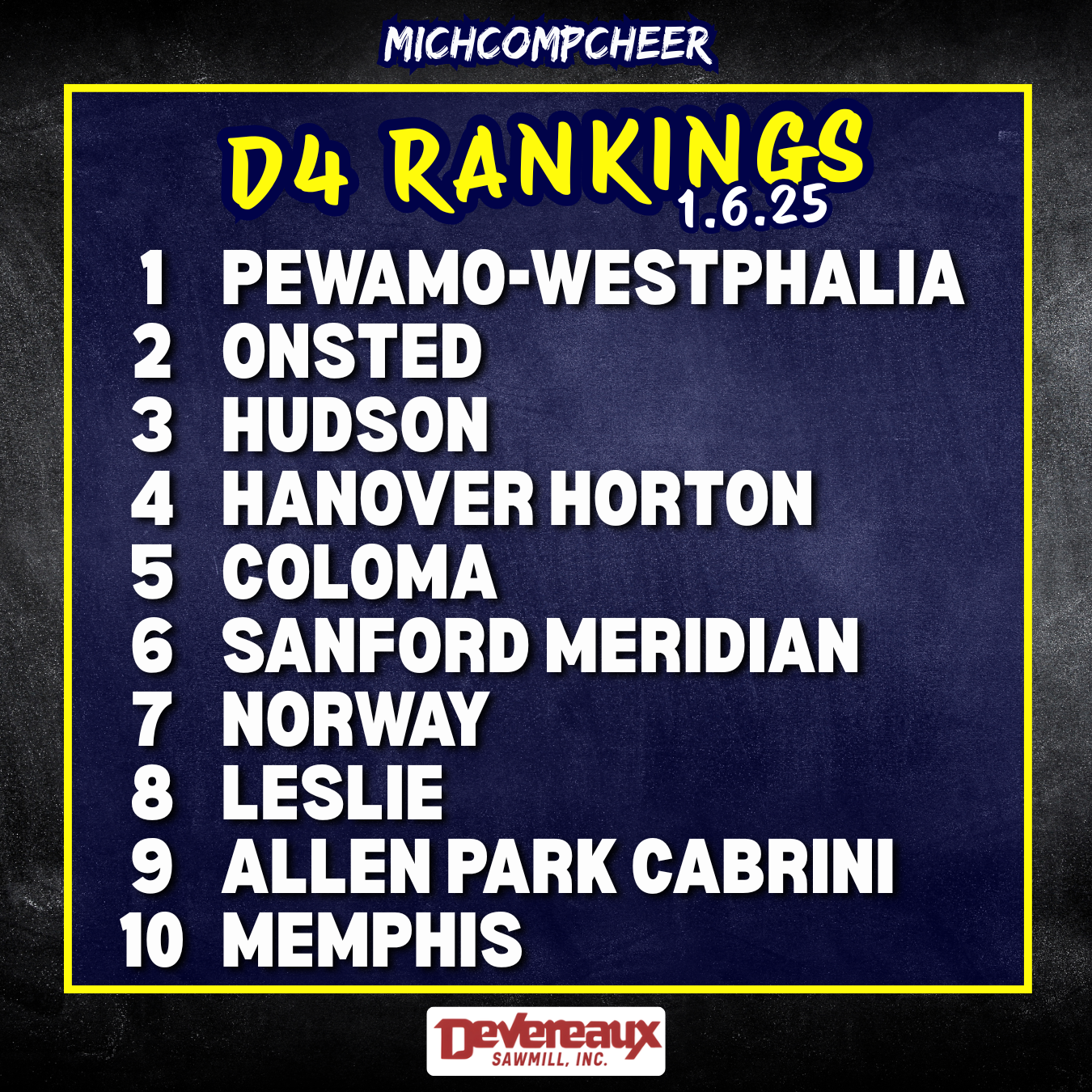 Pewamo-Westphalia Competitive Cheer enters the weekend ranked No. 1 overall in Division 4, according to MichCompCheer rankings. The Pirates currently hold the highest average total score in the division at 727.28 points, separating themselves from the rest of the field as the season progresses.